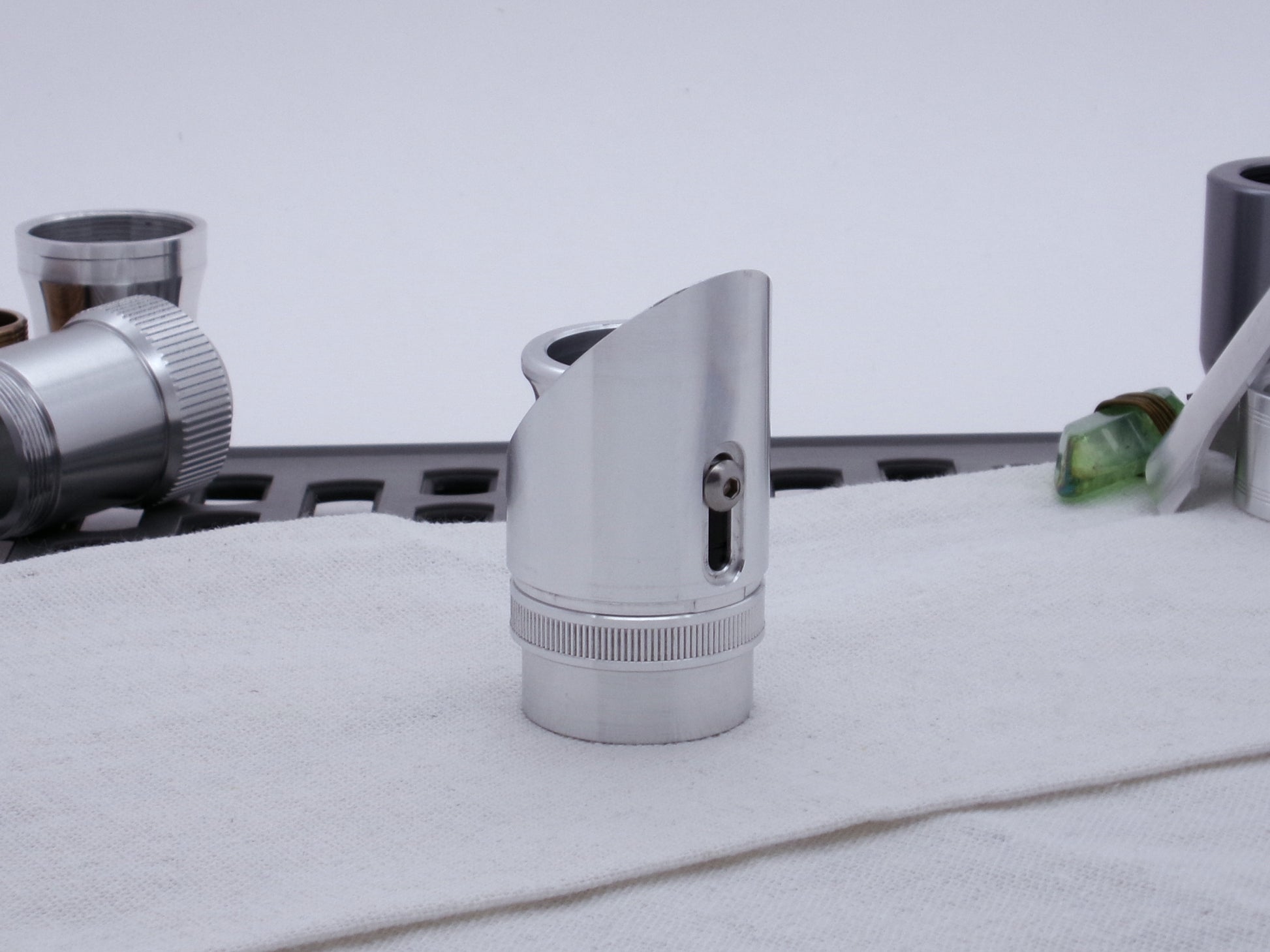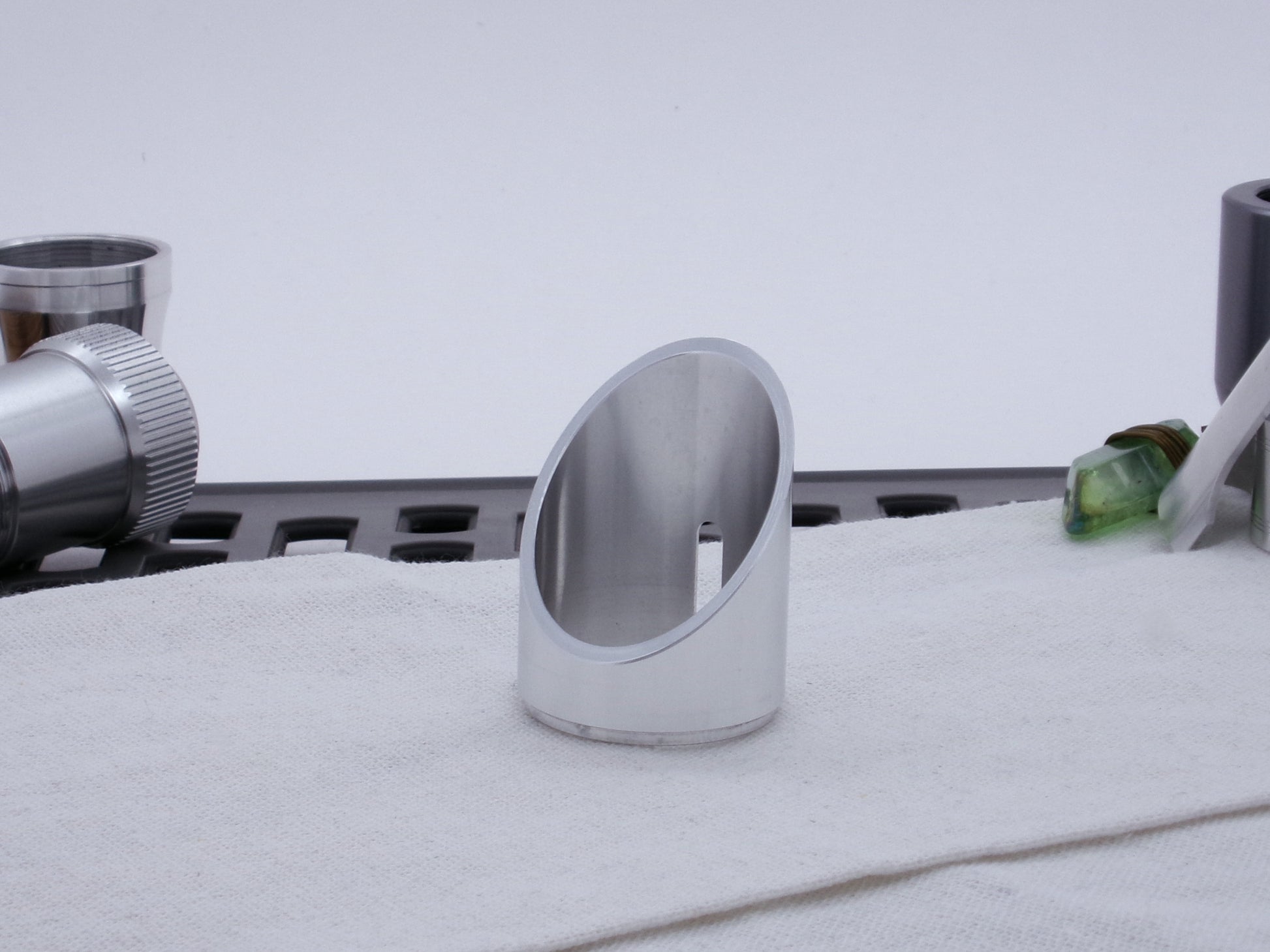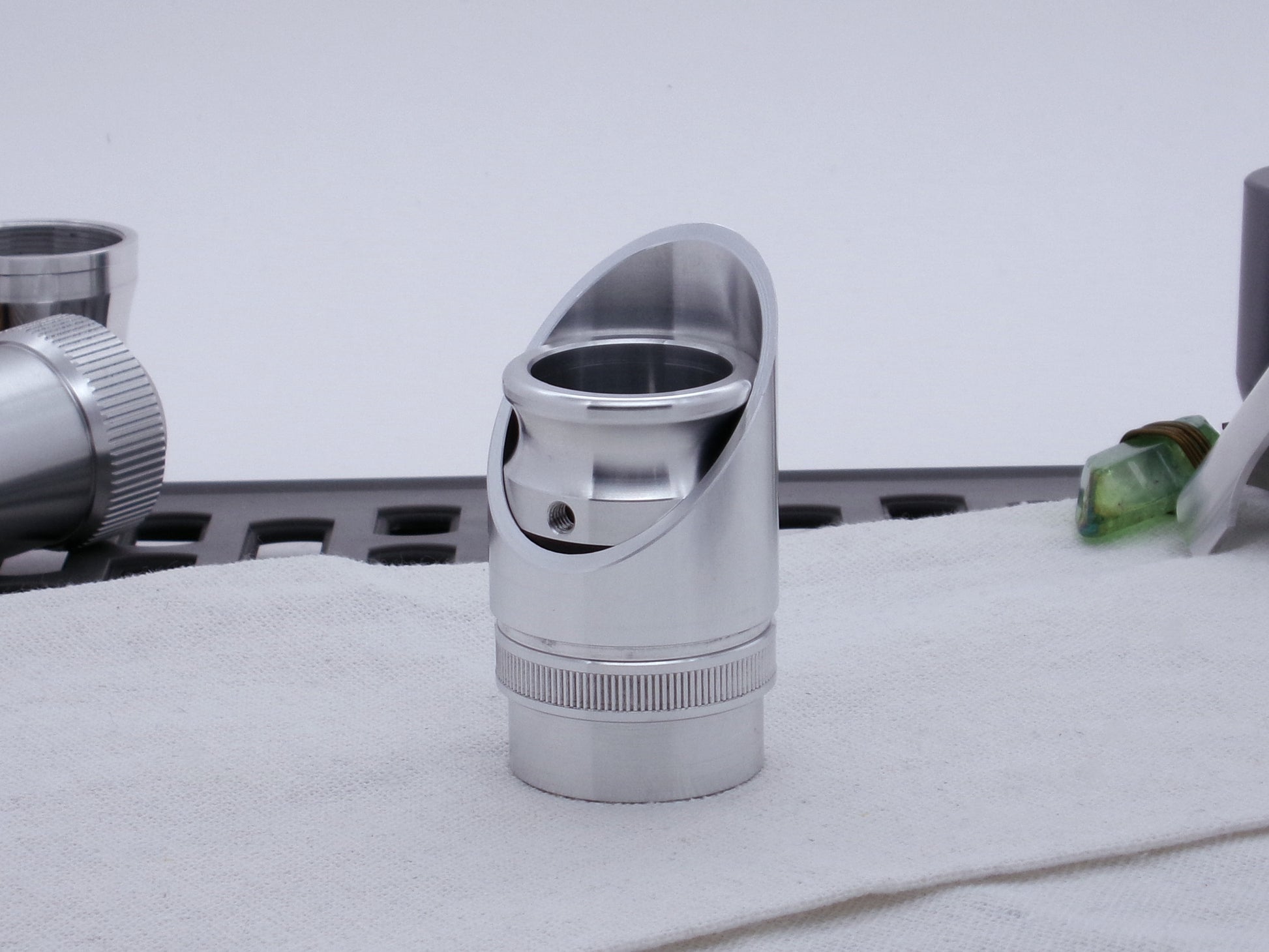 Manufactured from 6061-T6 aluminum, this 45 degree cut Darth Vader-inspired Emitter Shroud surely looks the part! Channeling the Original Trilogy prop design, this component is modeled off the original Micro Precision Products flash gun shroud, but scaled to fit the Variable Hilt Component (VHC) System! The keyed lower mount surface locks into the MPP-M Accent Ring to complete the Dark Lord vibe!